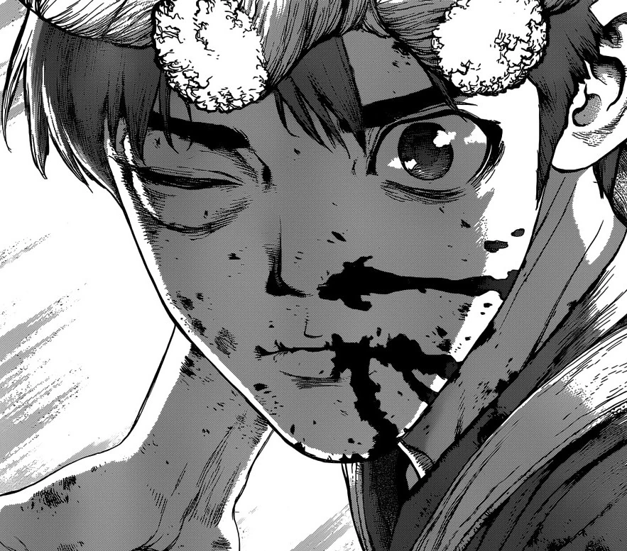 Prosiguiendo con la batalla de Chrome y Magma, el primero le asegura a Senku que se percato de los requisitos para lograr que un lente pueda actuar como lupa. Es entonces que Senku recapituliza y se da cuenta que su compañero completo la forma del lente cóncavo con agua y sudor para obtener un lente convexo. En ese mismo momento y a sorpresa de todos Gen Asagiri entra en escena sobre el puente de la aldea.