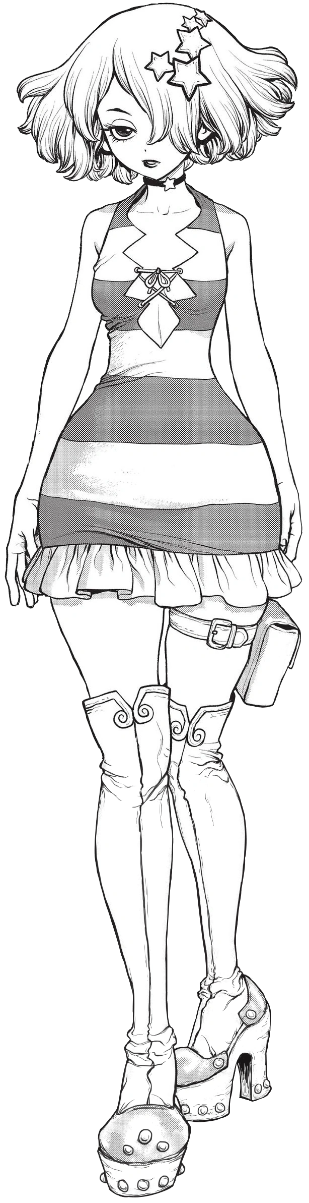Она носит короткое, облегающее полосатое платье с открытой спиной, а так же чокер со звездой. У Луны так же есть мешочек, обвёрнутый вокруг левого бедра и пара длинных, выше колен, сапог розового цвета. Её шрам от окаменения имеет форму звезды и находится на нижней части спины.