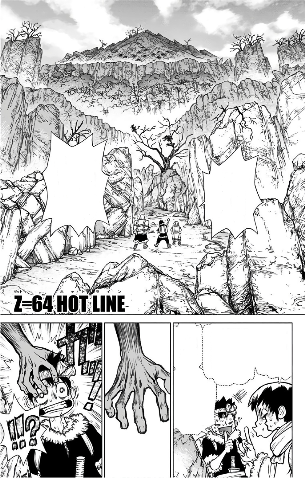 Chrome, Gen, and Magma reach the border of the Tsukasa Empire, and see the numbered statues of those Tsukasa plans to revive. They discuss damaging the statues, so even if they were to be revived they'd be handicapped and unable to fight. Gen initially agrees to the plan, but then aborts it because he lacks the courage. Magma immediately halts, and they move on.