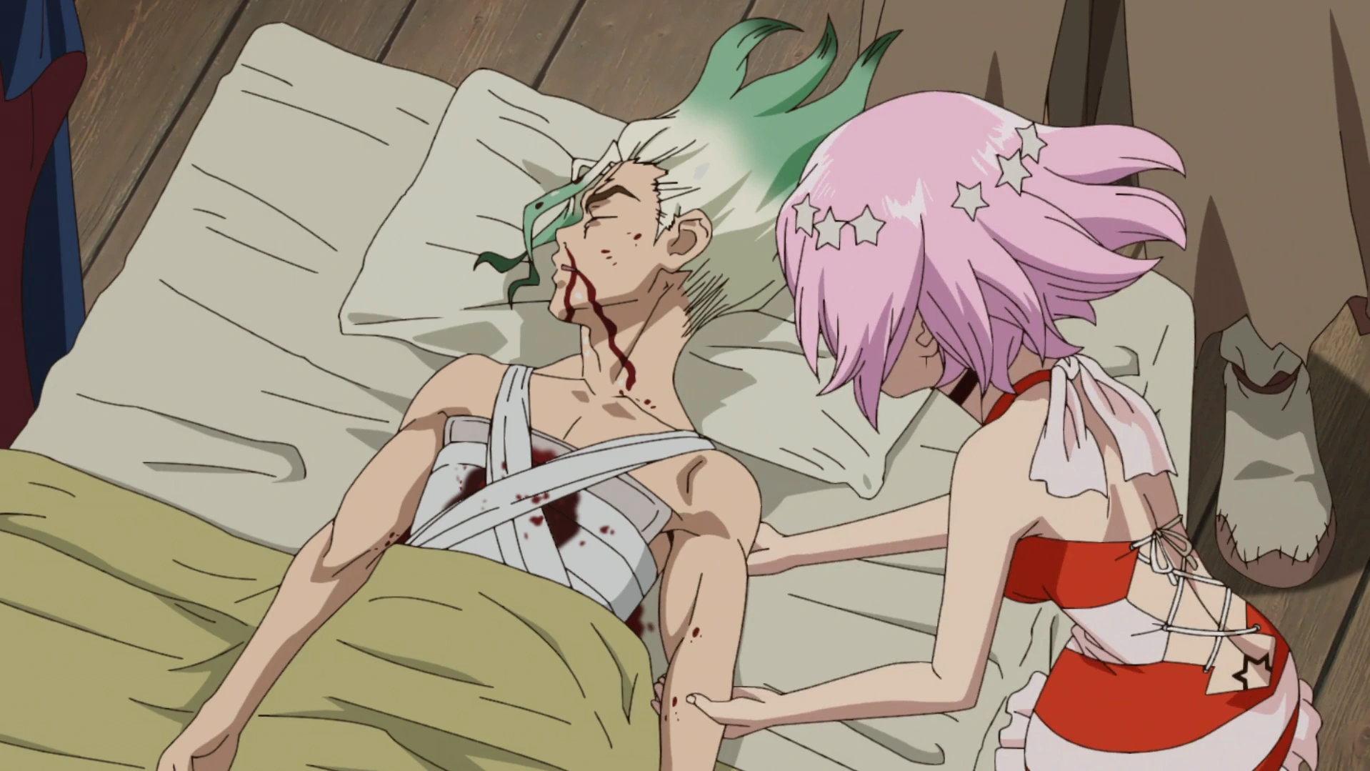 Luna remained on the Perseus where she tended to the wounds of Senku.[7]