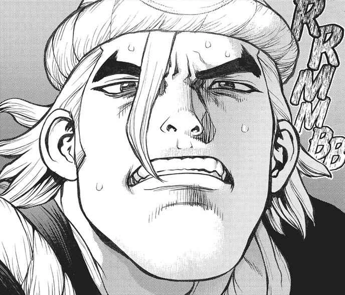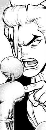 He, Mantle, and Carbo attempt to attack Senku while he is making a lightning rod[2], but are stopped by Gen who draws their attention with magic tricks. He attacks Gen Asagiri, whom he believes to be Senku. Unbeknownst to him, Gen survived.[3]