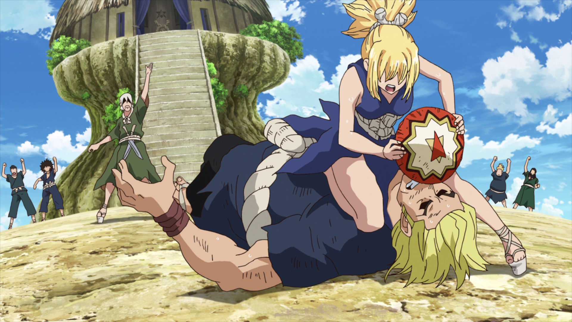 When Senku starts discussing his goals of travelling the world for other allies, he brings up the necessary roles that need to be filled. Ukyo mentions that in addition to a navigator and scientist, someone ready to leap into action is necessary. Magma suggests running another Grand Bout to determine the mightiest person, but Senku tells him they already know who that is: Tsukasa.[48]