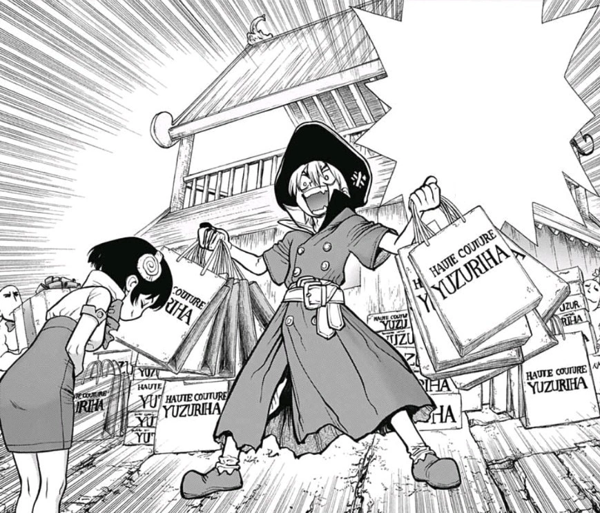 After learning money doesn't exist in the stone world, he makes his own. Ryusui is later disturbed by Senku manipulating everyone with the currency to benefit his plans. This left him questioning Senku's morals. Senku and Gen manage to take a good deal of money from him, when they have Yuzuriha Ogawa create a clothing store. He is so excited about his purchases, before realizing he played into Senku's hands. [2]